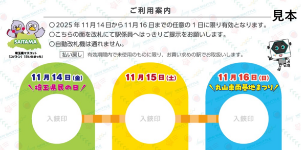 ニューシャトルでは、埼玉県民の日を記念して11月14日(金)から11月16日(日)までの3日間のうち1日限り有効の「埼玉県民の日記念ニューシャトル1日フリー乗車券」を発売いたします。
